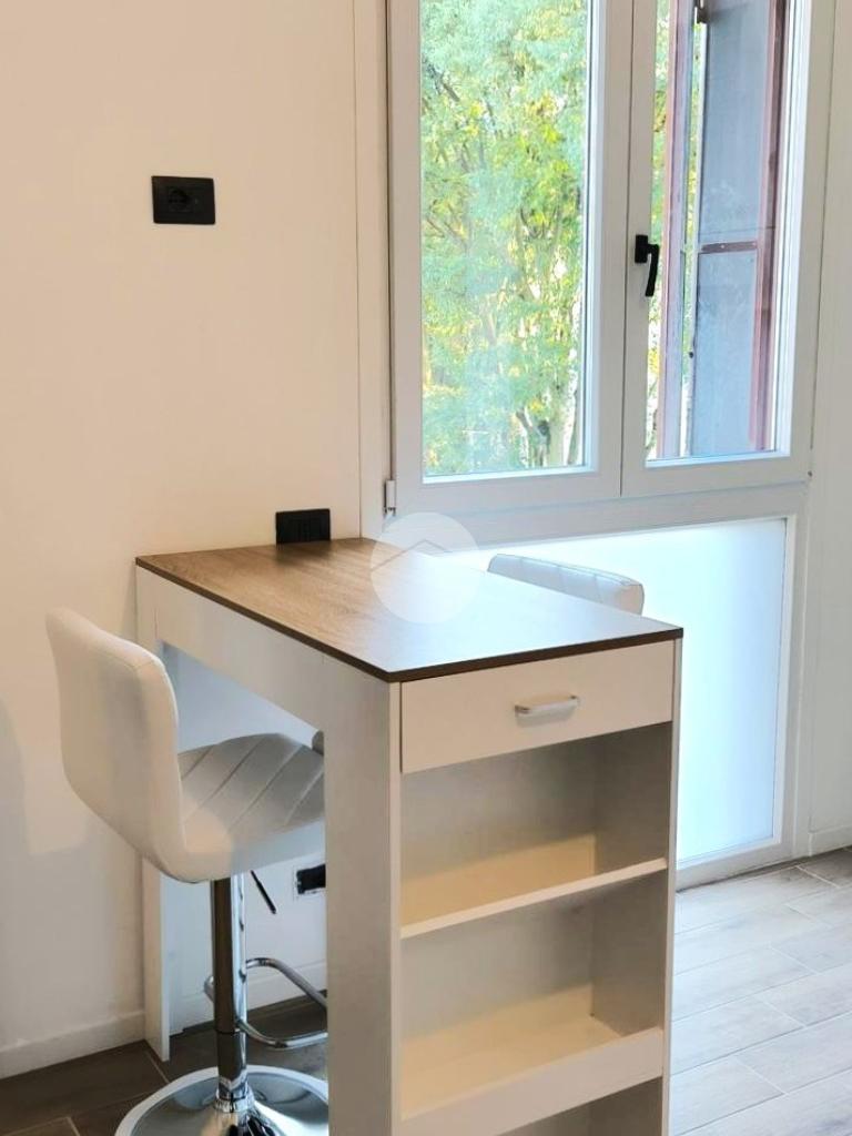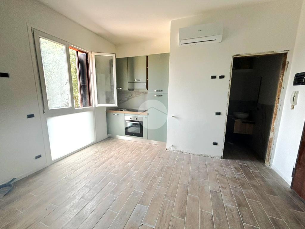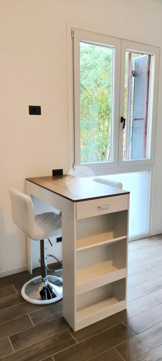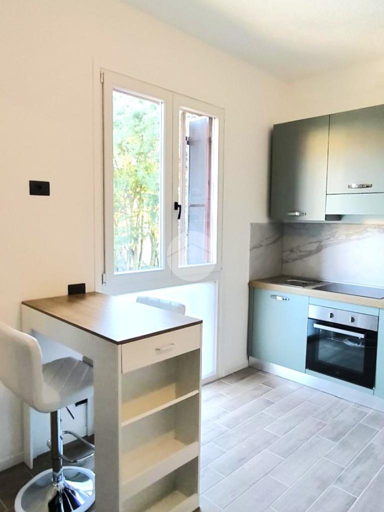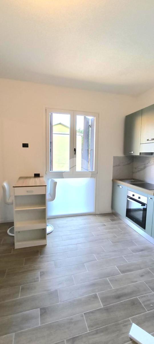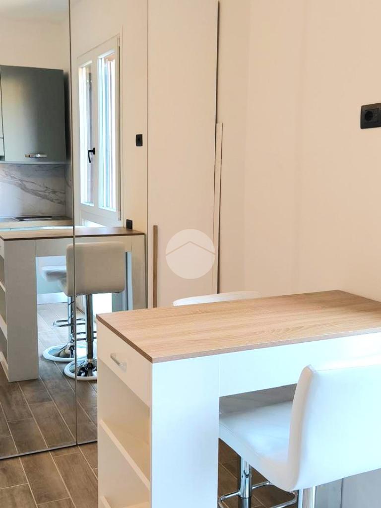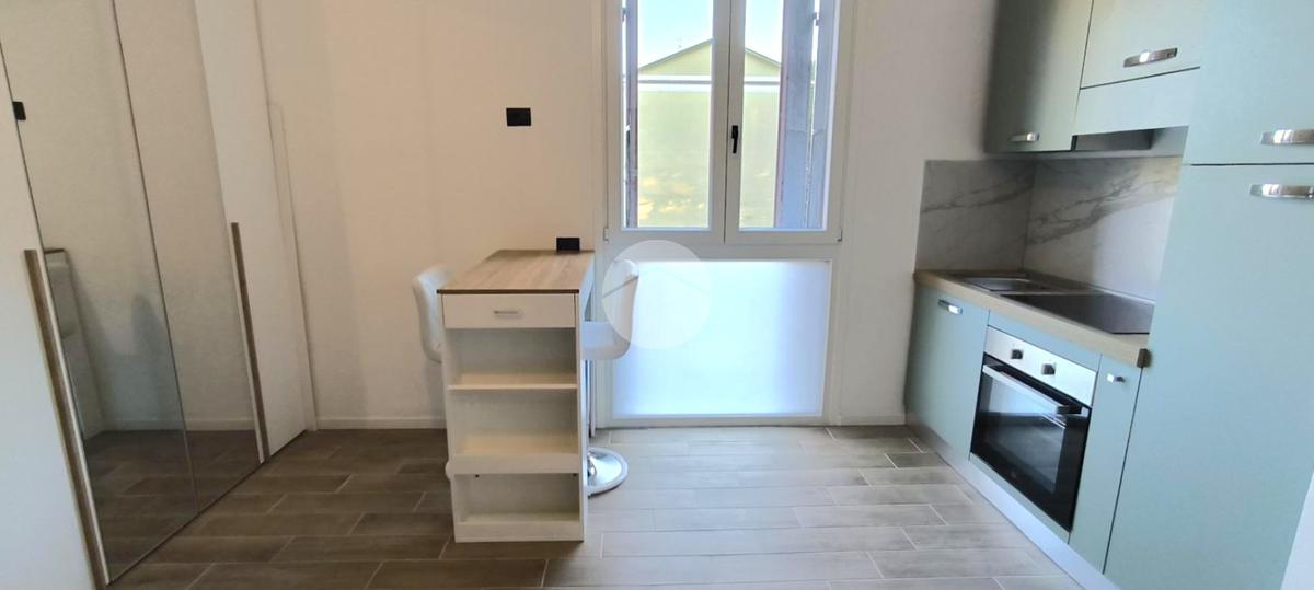 L’appartamento è composto da un unico ambiente principale luminoso, con cucina a vista moderna e funzionale, dotata di piano cottura ad induzione, forno e spazio per la zona pranzo. La zona giorno/notte è arredata con divano letto e armadiatura su misura.