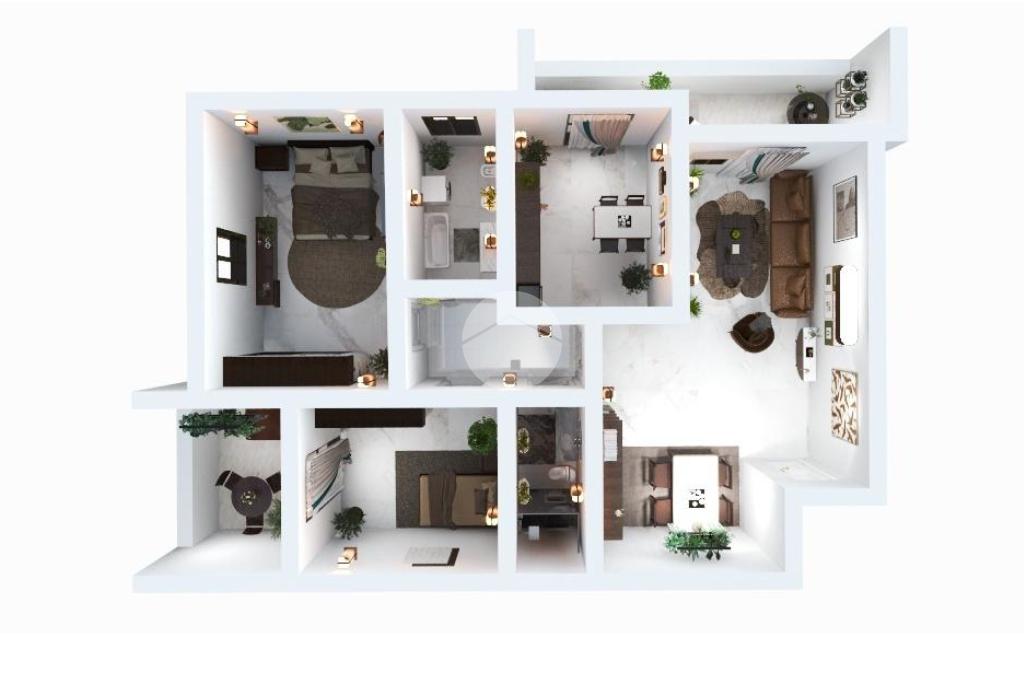 L'appartamento si compone da ingresso su ampio soggiorno con angolo adibito a sala da pranzo e uscita sul primo balcone collegato alla cucina abitabile; un corridoio conduce alle due camere da letto di cui la cameretta con accesso al secondo balcone e due servizi ben rifiniti uno con box doccia e uno con vasca.