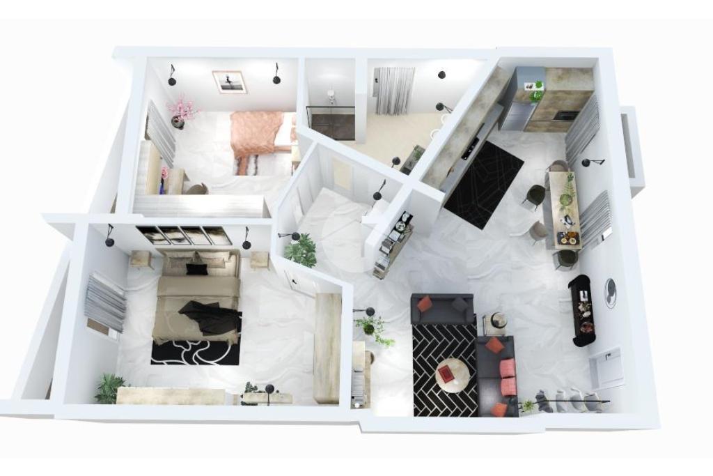 Si compone da ingresso su ampio e accogliente soggiorno con cucina a vista, curati nei minimi dettagli e con accesso al primo balcone, che regala luce naturale all'appartamento. Tramite disimpegno si passa alla zona notte, un vero angolo di relax composto dalla camera matrimoniale con cabina armadio e accesso al secondo balcone, la cameretta di generose dimensioni anch'essa con uscita sul terzo balcone. Conclude un bagno finestrato ampio e luminoso con box doccia. Nel disimpegno, inoltre, si ha una zona lavanderia.