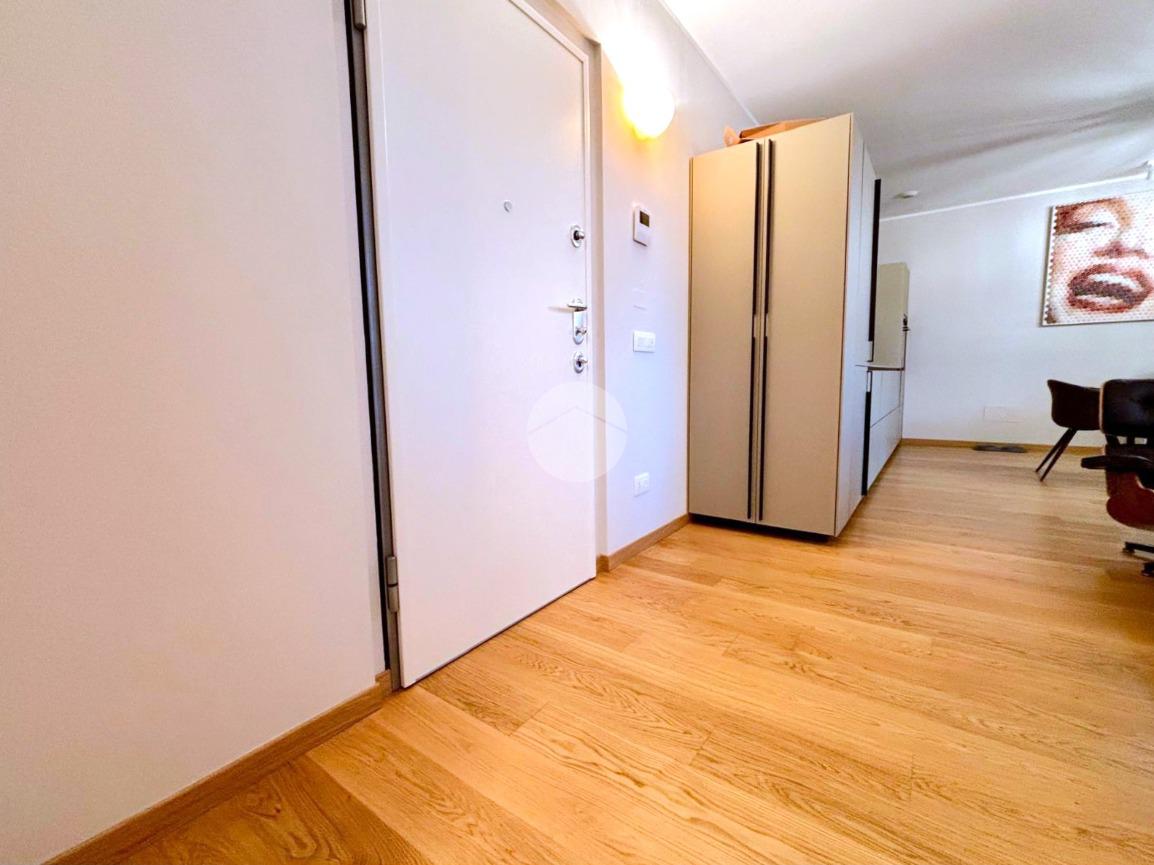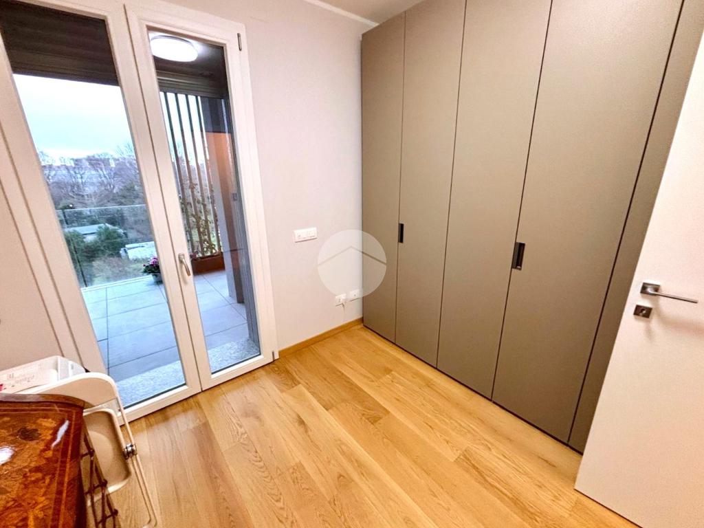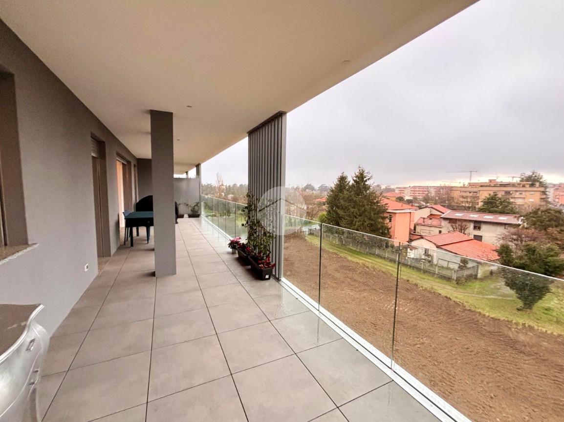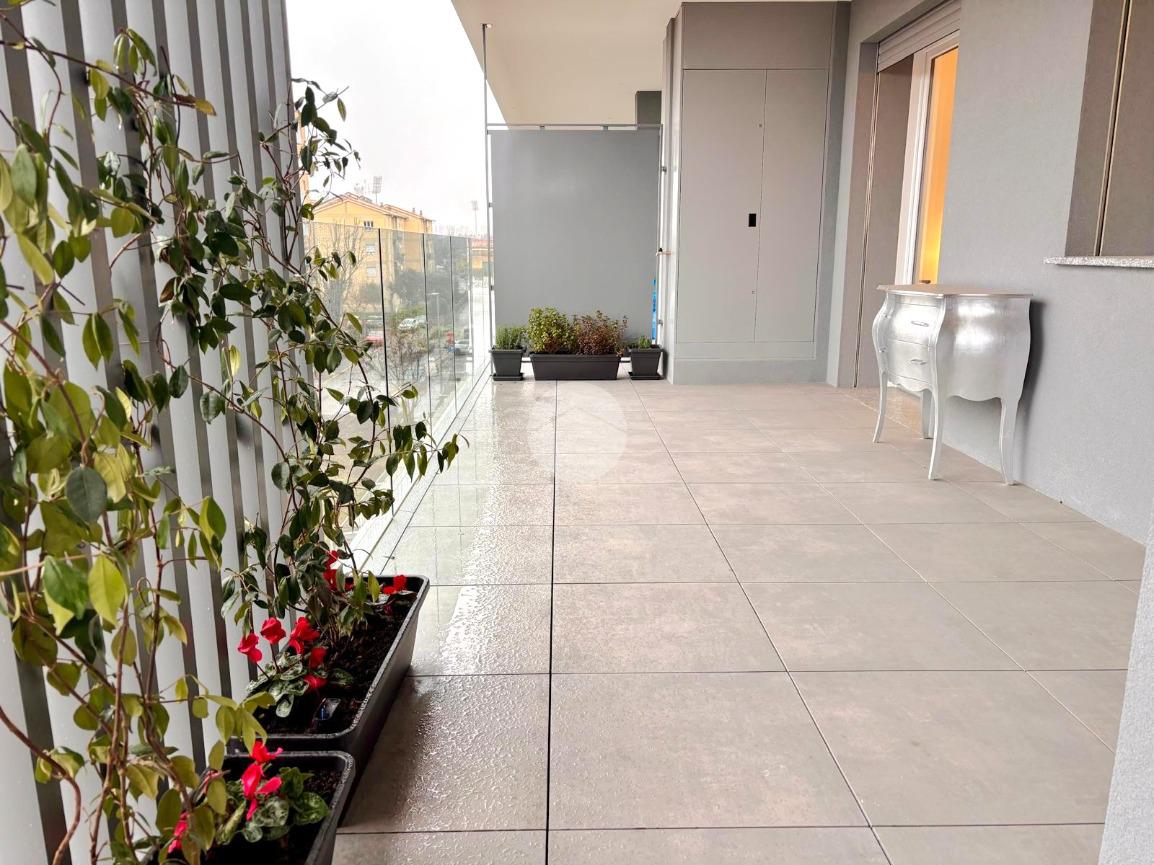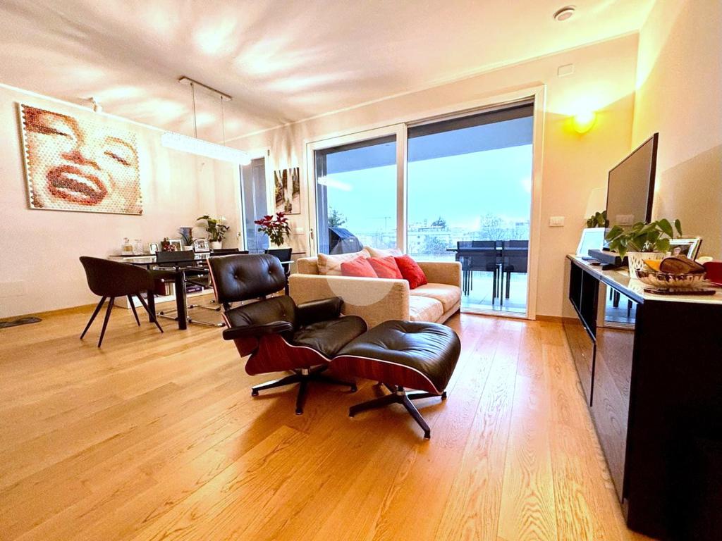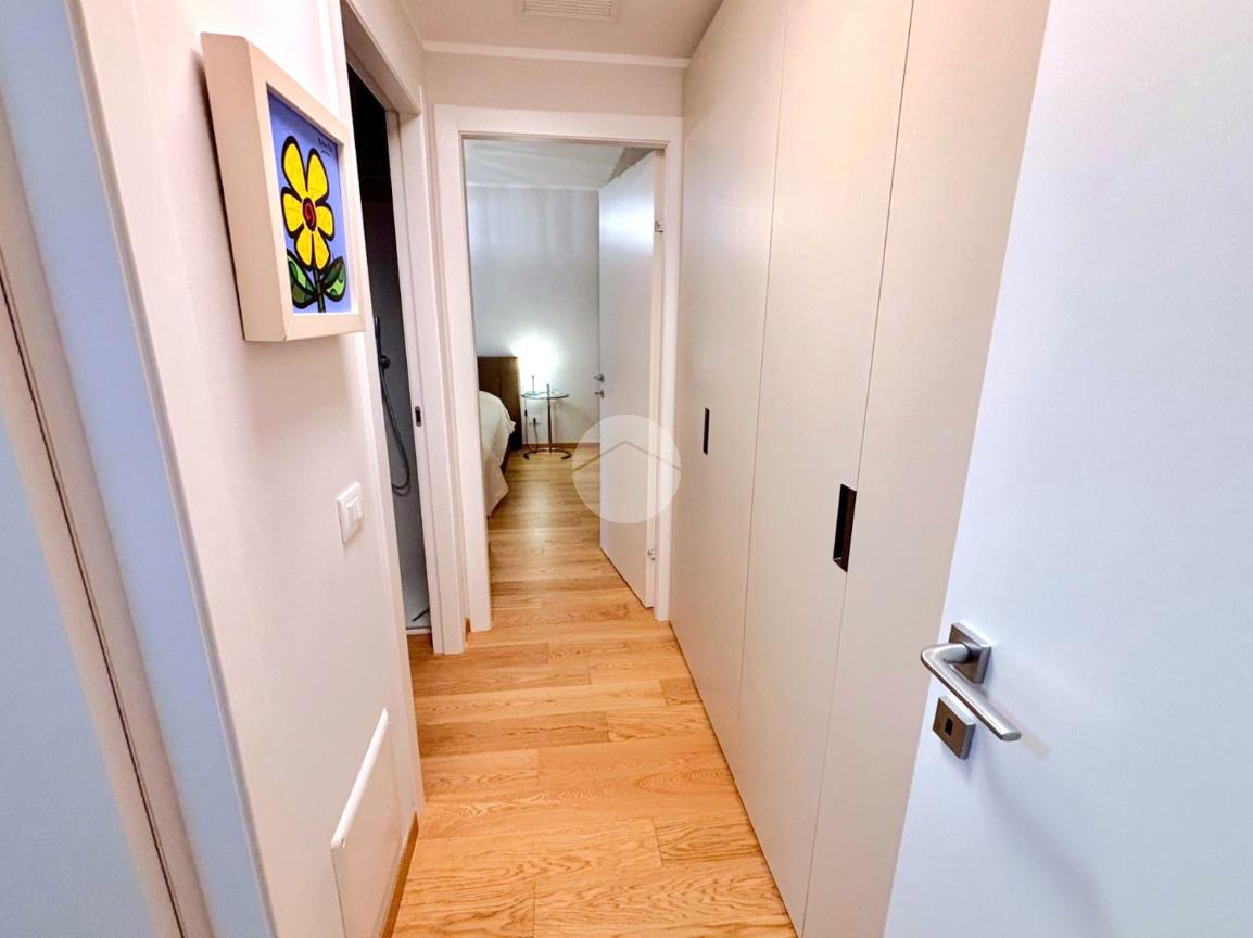 L'appartamento dispone di un ampio salotto con cucina a vista, un ambiente accogliente e luminoso, perfetto per momenti di convivialità e relax. Una vetrata panoramica si apre su un magnifico terrazzo loggiato di circa 40 metri quadrati, con esposizione a ovest, ideale per godere di tramonti suggestivi, pranzi e cene all'aperto. La camera da letto matrimoniale è spaziosa e progettata per garantire il massimo del comfort e della tranquillità. È inoltre presente uno studio versatile, utilizzabile come cameretta, ufficio per smart working o area relax a seconda delle esigenze. Il bagno è elegante e rifinito con materiali di alta qualità, offrendo un tocco di raffinatezza in più.