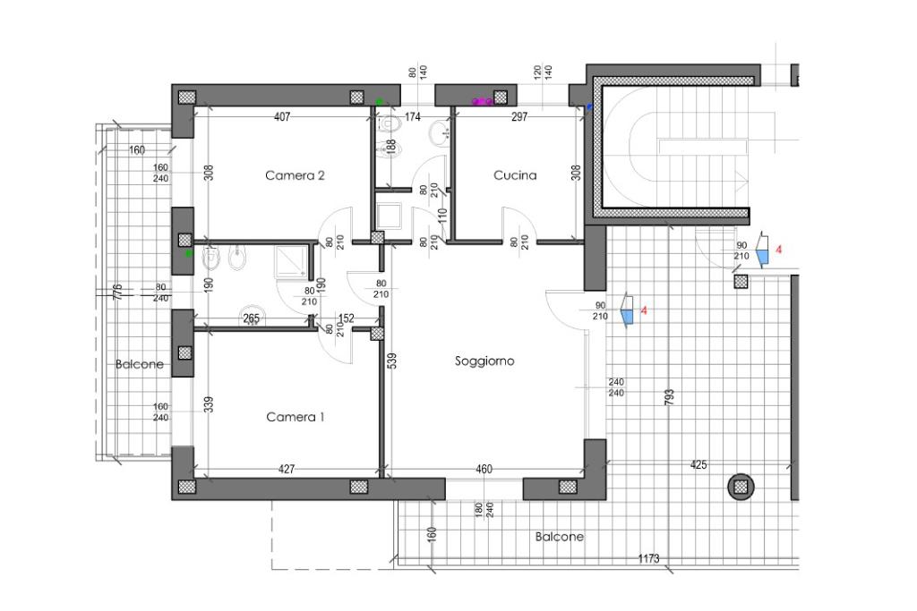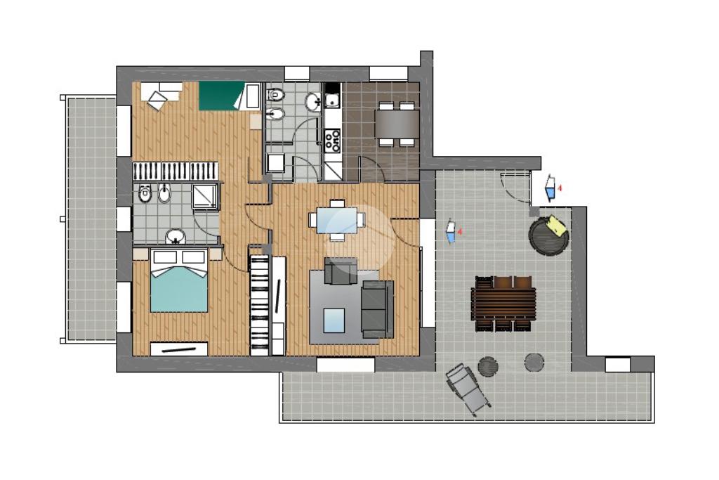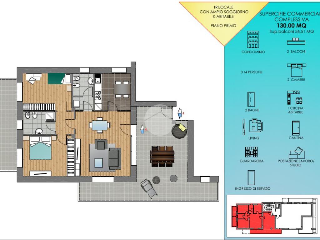 L'Appartamento N. 4 è un trilocale con tripla esposizione situato al piano primo dell'edificio dotato di ascensore e vanta di un ampio terrazzo.
