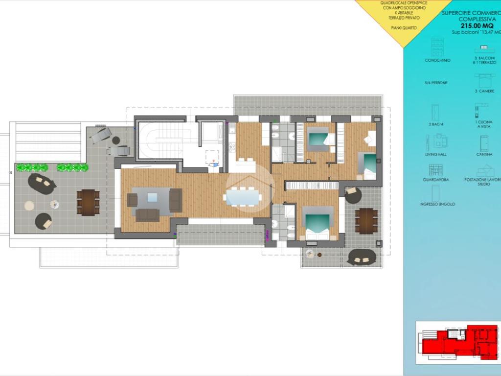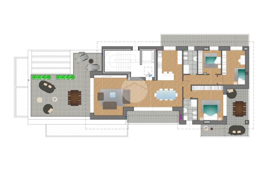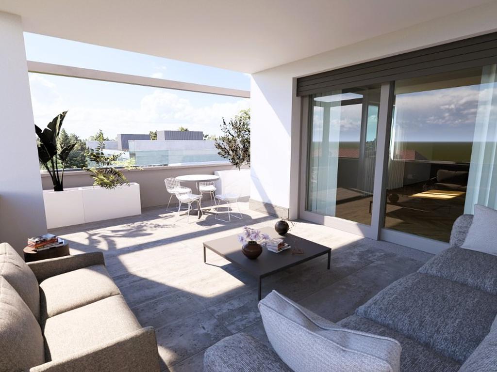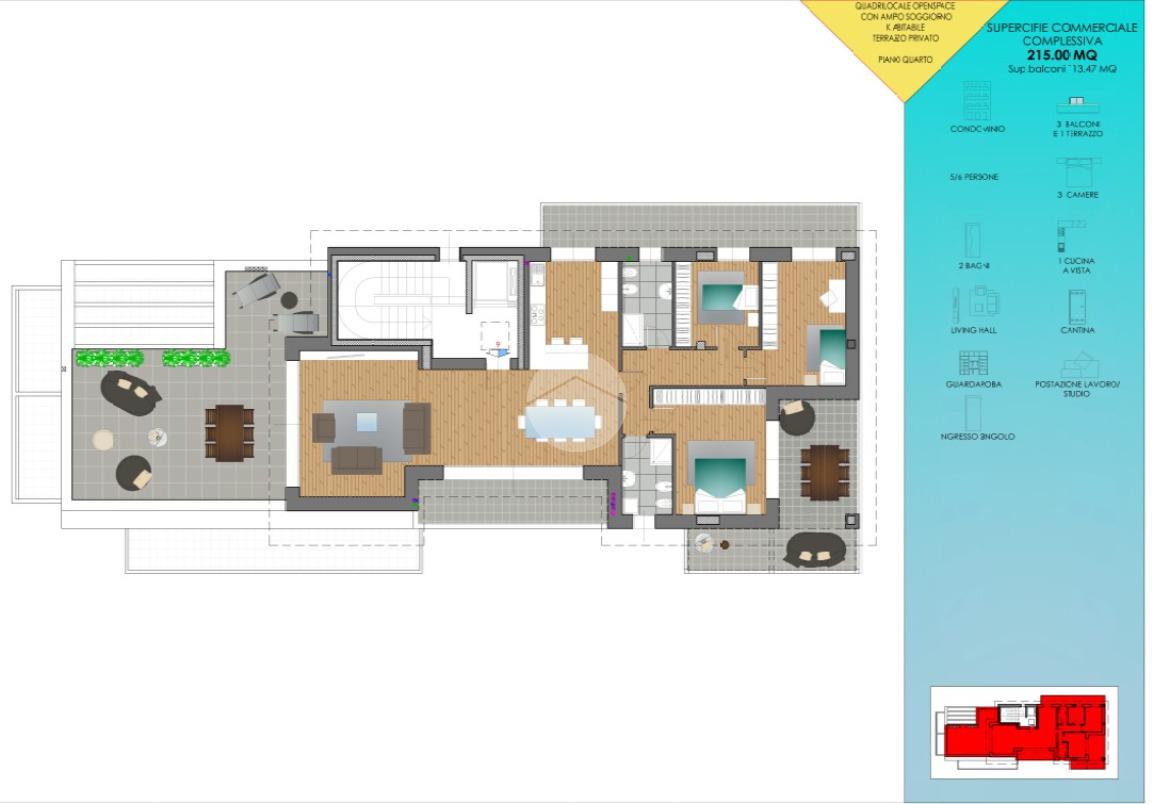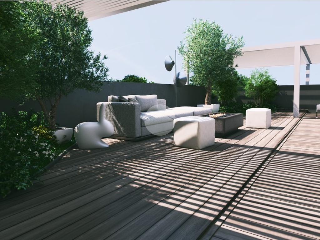 Entrando nella soluzione si ha accesso all'ampia ed elegante zona giorno con cucina a vista e accesso diretto al terrazzo di circa 60mq e ad un secondo terrazzo di circa 12mq tramite una grande vetrata scorrevole che permette alla luce naturale di illuminare l'appartamento. La zona notte è ben distribuita e composta da tre camere da letto di ampie dimensioni per garantire al meglio tranquillità e relax. La camera matrimoniale ha accesso al terzo terrazzo di circa 23mq, mentre le altre due camere accedono al quarto terrazzo di circa 18mq. Concludono due servizi di pregio che seguono l'eleganza della palazzina e dell'appartamento.