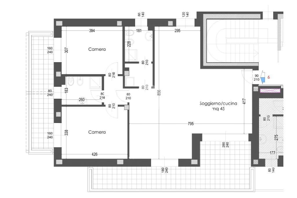 L'Appartamento N. 6 è un trilocale con tripla esposizione situato al piano secondo dell'edificio dotato di ascensore e vanta di un ampio terrazzo.