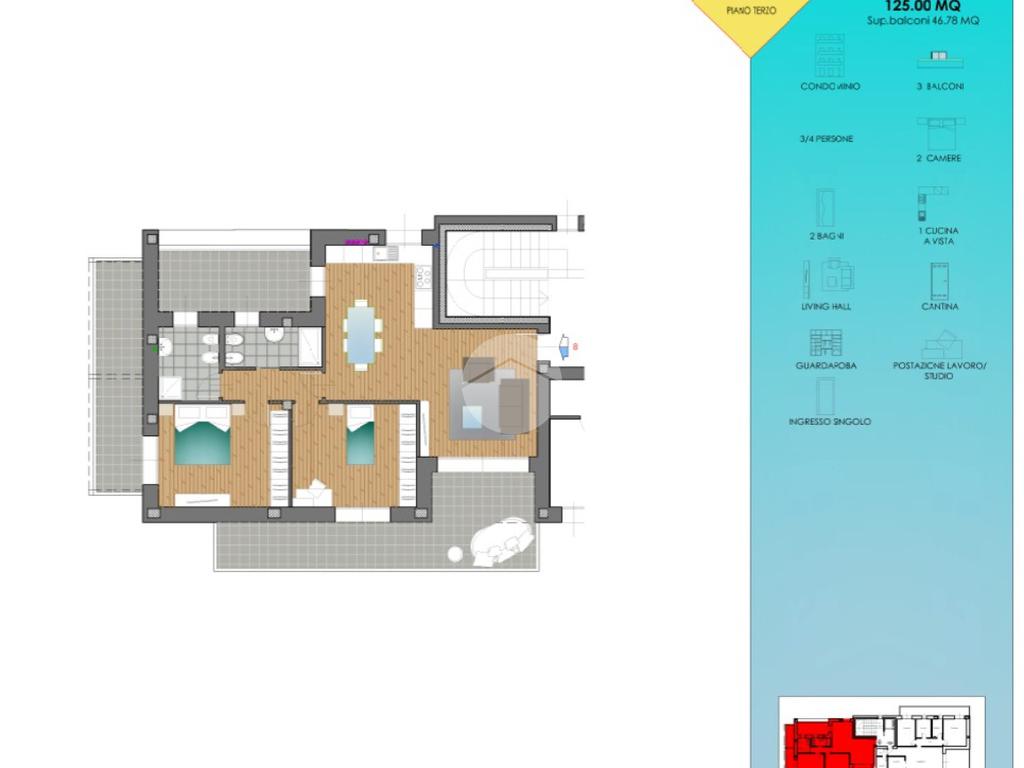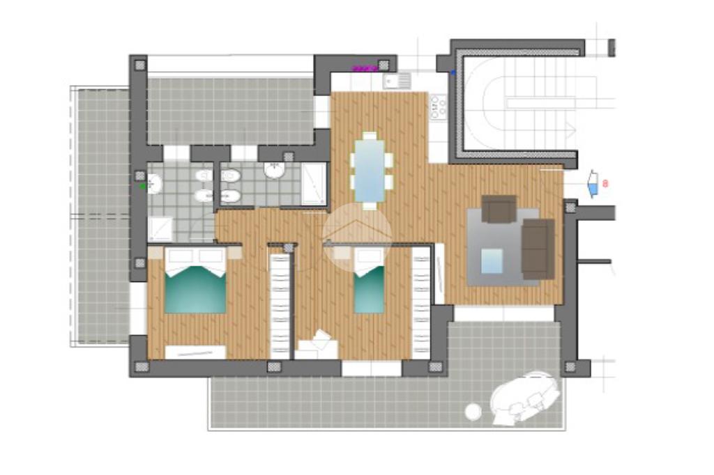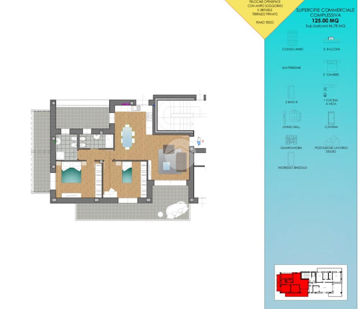 L'Appartamento N. 8 è un trilocale con tripla esposizione situato al piano terzo dell'edificio dotato di ascensore e vanta di un ampio terrazzo.