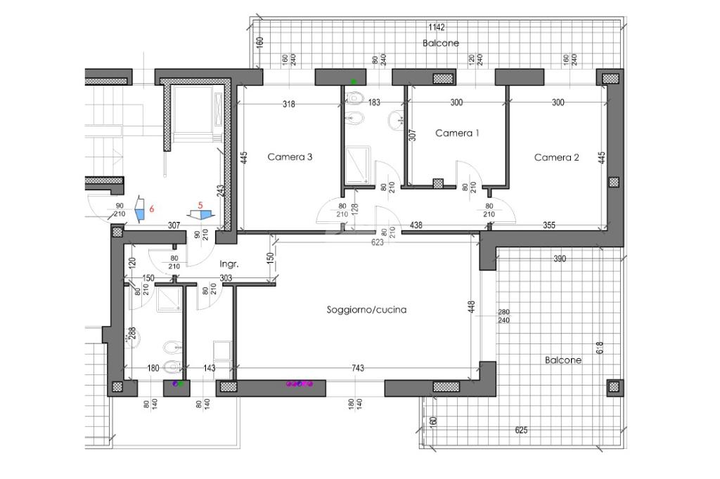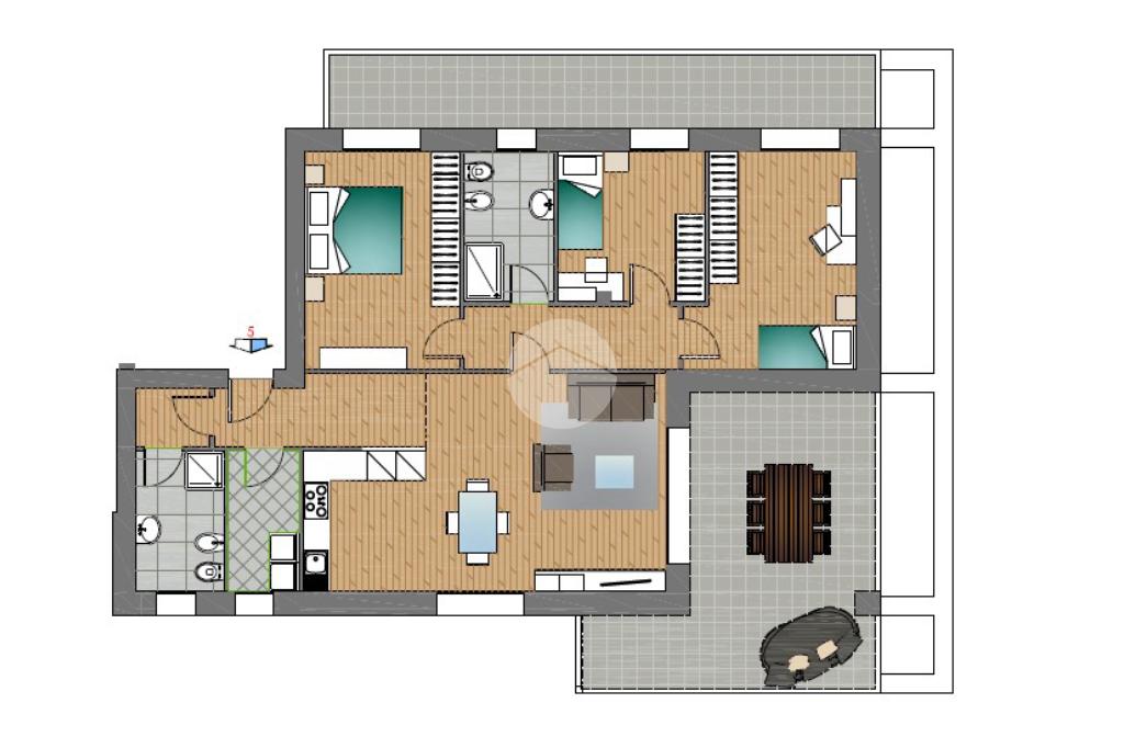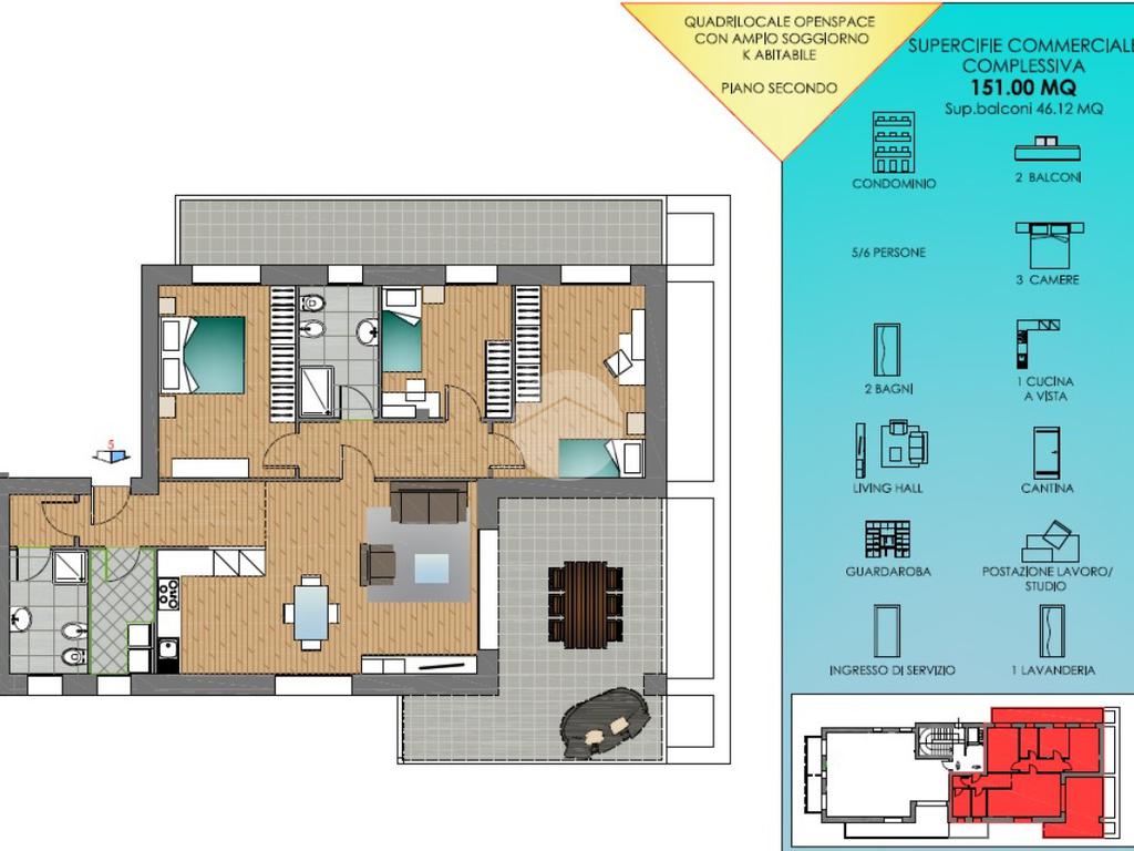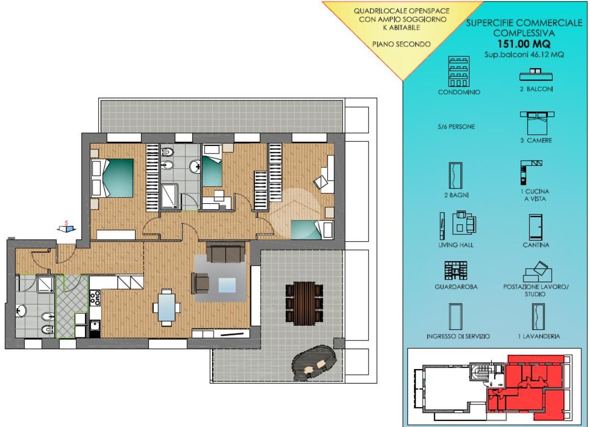 L'Appartamento N. 5 è un quadrilocale con tripla esposizione situato al piano secondo dell'edificio dotato di ascensore e vanta di un ampio terrazzo.